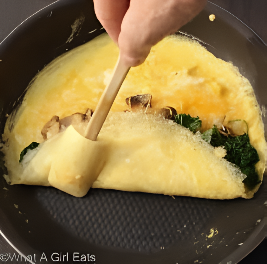 Inside, you'll discover a delightful combination of sautéed onions, earthy mushrooms, fresh spinach, and creamy feta cheese. This omelette is a harmonious blend of savory and wholesome ingredients, perfect for those seeking a meatless breakfast option that's both satisfying and delicious.
